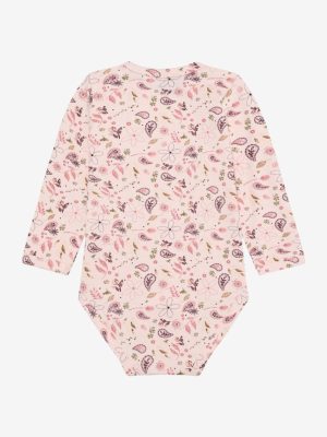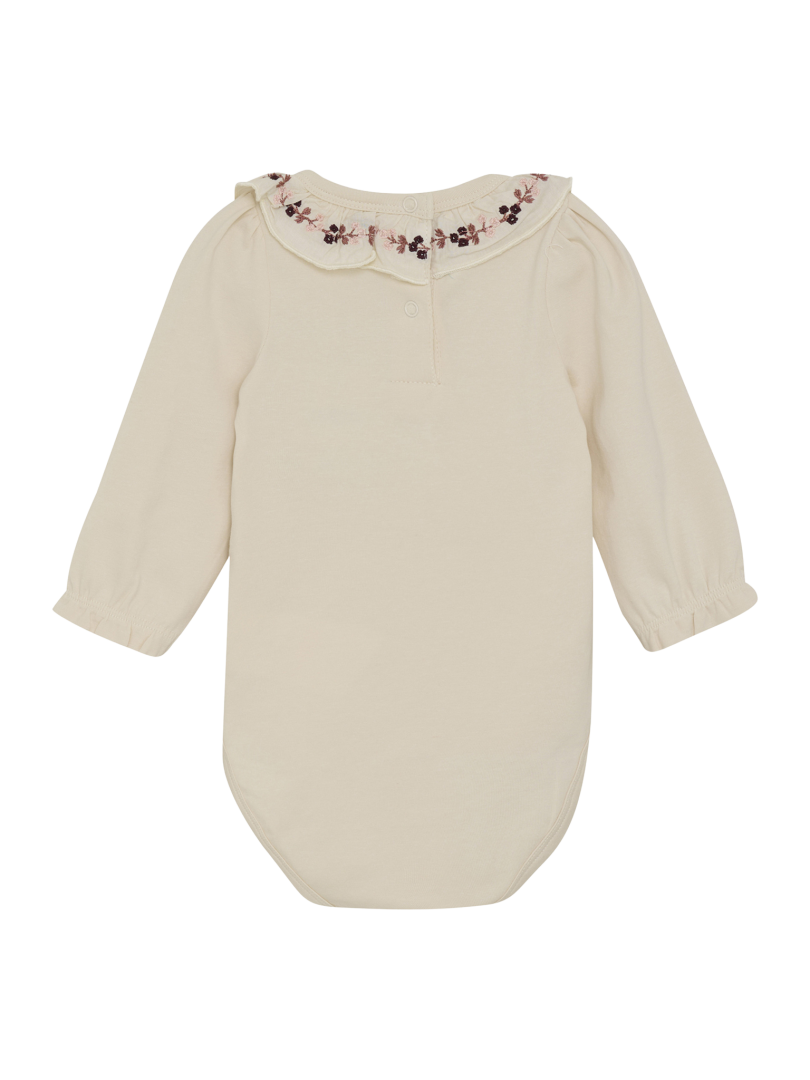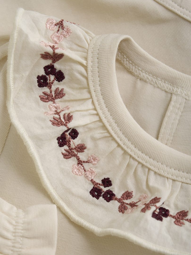 Cute long-sleeve bodysuit featuring a beautiful collar adorned with embroidered floral details. The bodysuit has elasticated cuffs, creating delicate frill details, and snap buttons at the neck and between the legs for easy dressing.