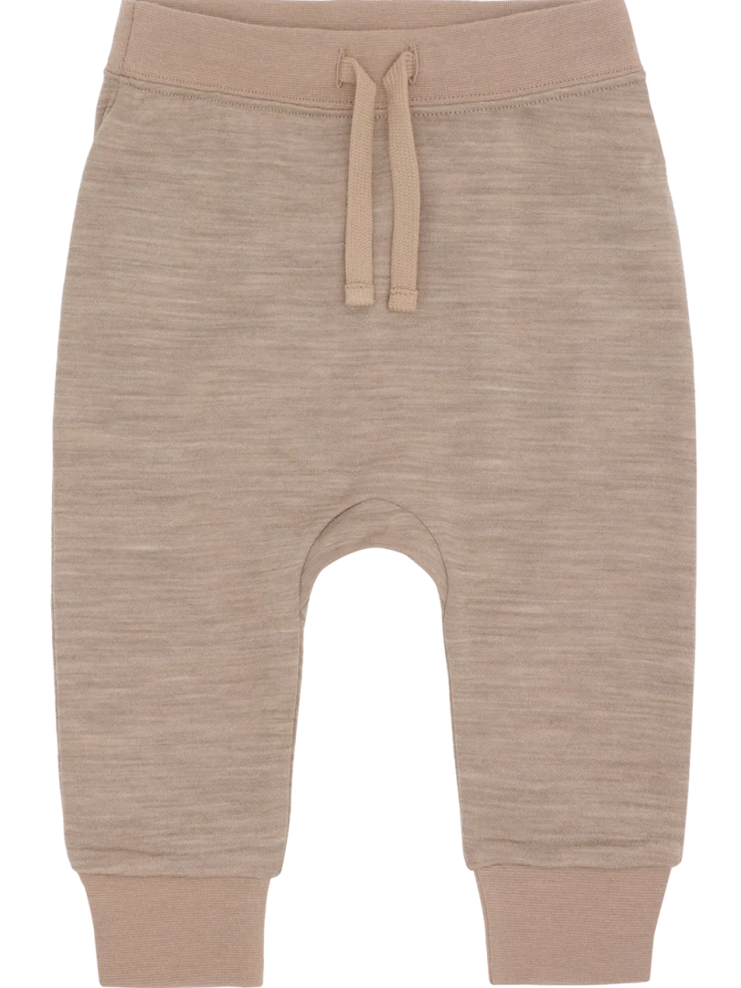 Buksen som sørger for at den lille kan leke komfortabelt hele dagen. En baggy bukse med elastisk snor i midjen. Naturlig og pustende material av ull/bambus blanding.