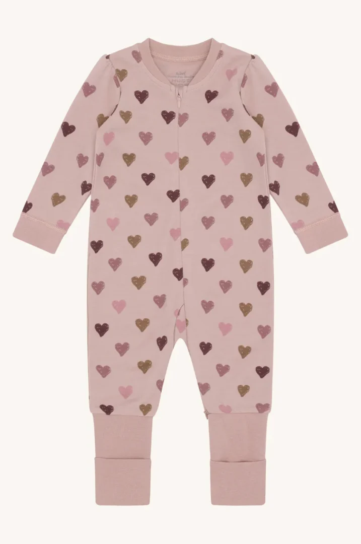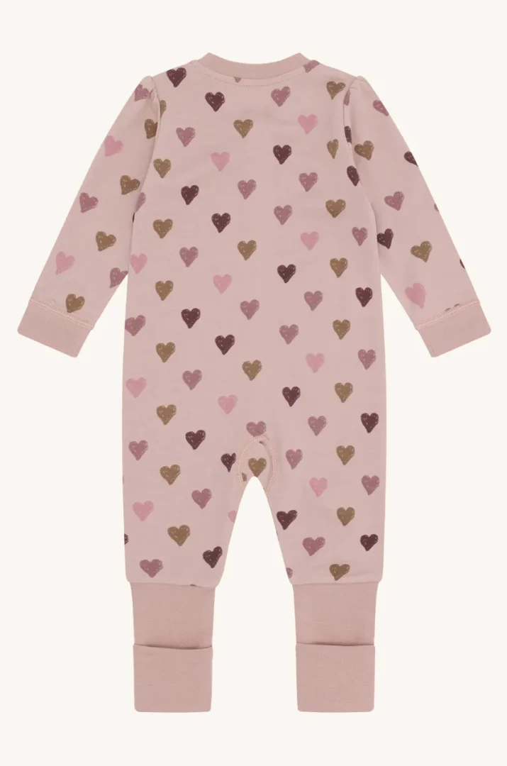 Langermet nattdrakt i behagelig, elastisk ull- og bambusviskoseblanding med hjertemønster. Drakten har rynkede skuldre og en lett asymmetrisk glidelås som går fra halsen og ned til venstre fot. Ved føttene er det en forlenget del som gjør at foten kan trekkes gjennom, eller brettes over for å fungere som sokker. Plagget har bambusviskose på innsiden og ull på utsiden.