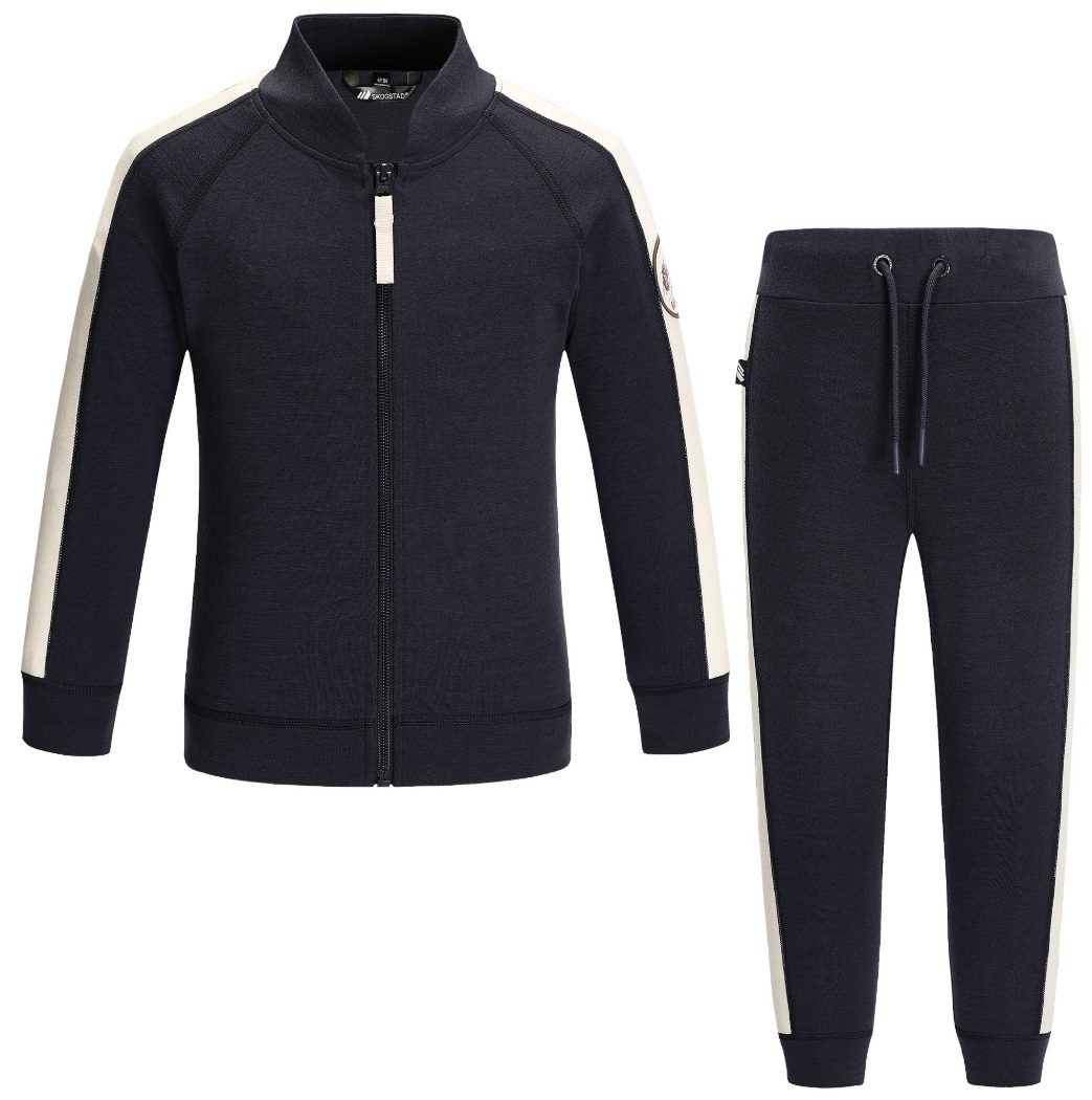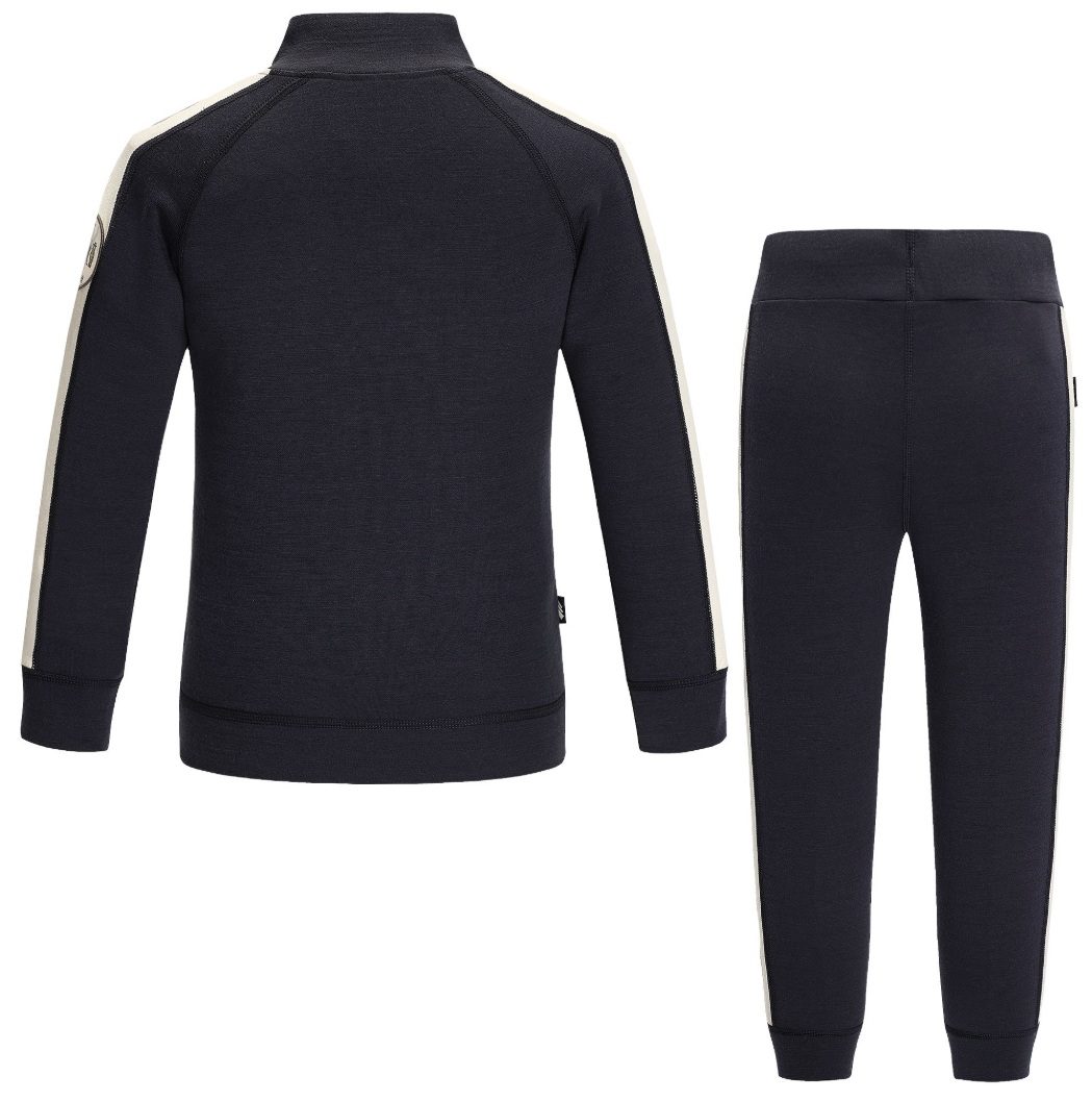 Jakken har en rett modell med krage og en synlig glidelås i front. Buksen har en elastisk linning med snorstramming som gir fleksibel passform og støtter bevegelsesfrihet. Yttersiden består av 100 % mulesingfri merinoull, kjent for sine naturlige isolerende og varmeregulerende egenskaper. Merinoullen holder barnet varmt i kjølige temperaturer, samtidig som den tilpasser seg kroppens behov. Innsiden er laget av bambusviskose som gir en ekstra myk følelse. Bambusviskosen har en naturlig antibakteriell effekt og trekker fuktighet bort fra huden, uten at plagget kjennes vått.