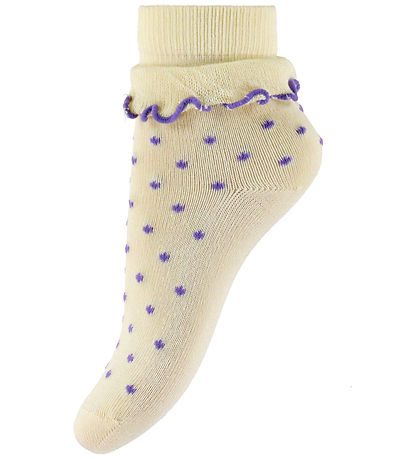 Sokker fra MiniPop med prikker og blondekant. minipop sokkene har et lavt skaft en elastisk kant, slik at sokkene holder seg der de skal. Størrelsen på sokkene er merket under foten, så de er enkle å finne og matche mellom familiens klesvask.