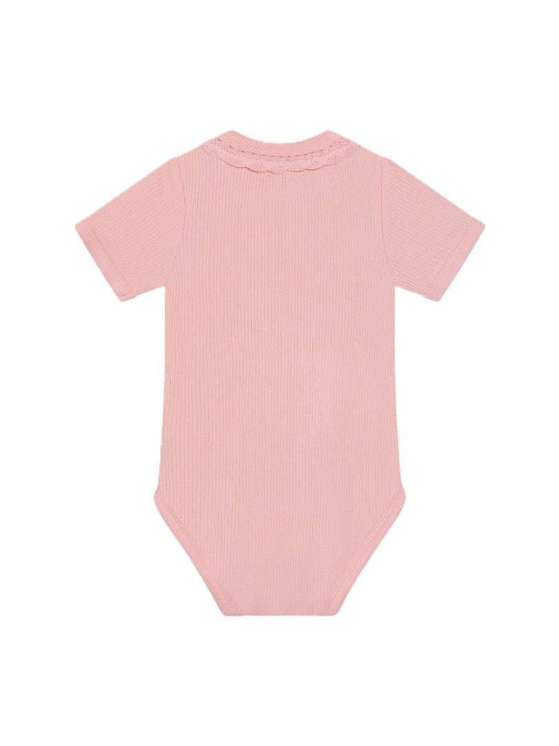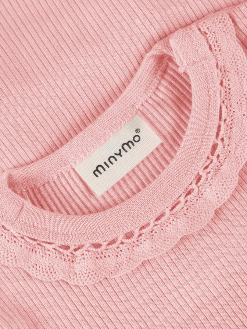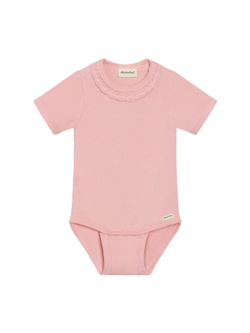 Kortermet body fra Minymo. Bodyen er laget av et ensfarget ribbestoff. Den lukkes med justerbare trykknapper mellom bena. Bodyen er laget av en bomullsblanding. Dette produktet inneholder TENCEL™-fibre. TENCEL™ er et varemerke for Lenzing AG.