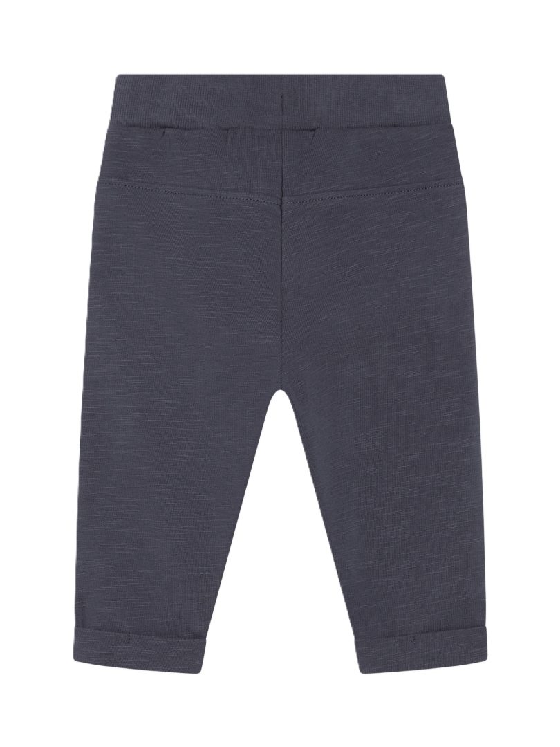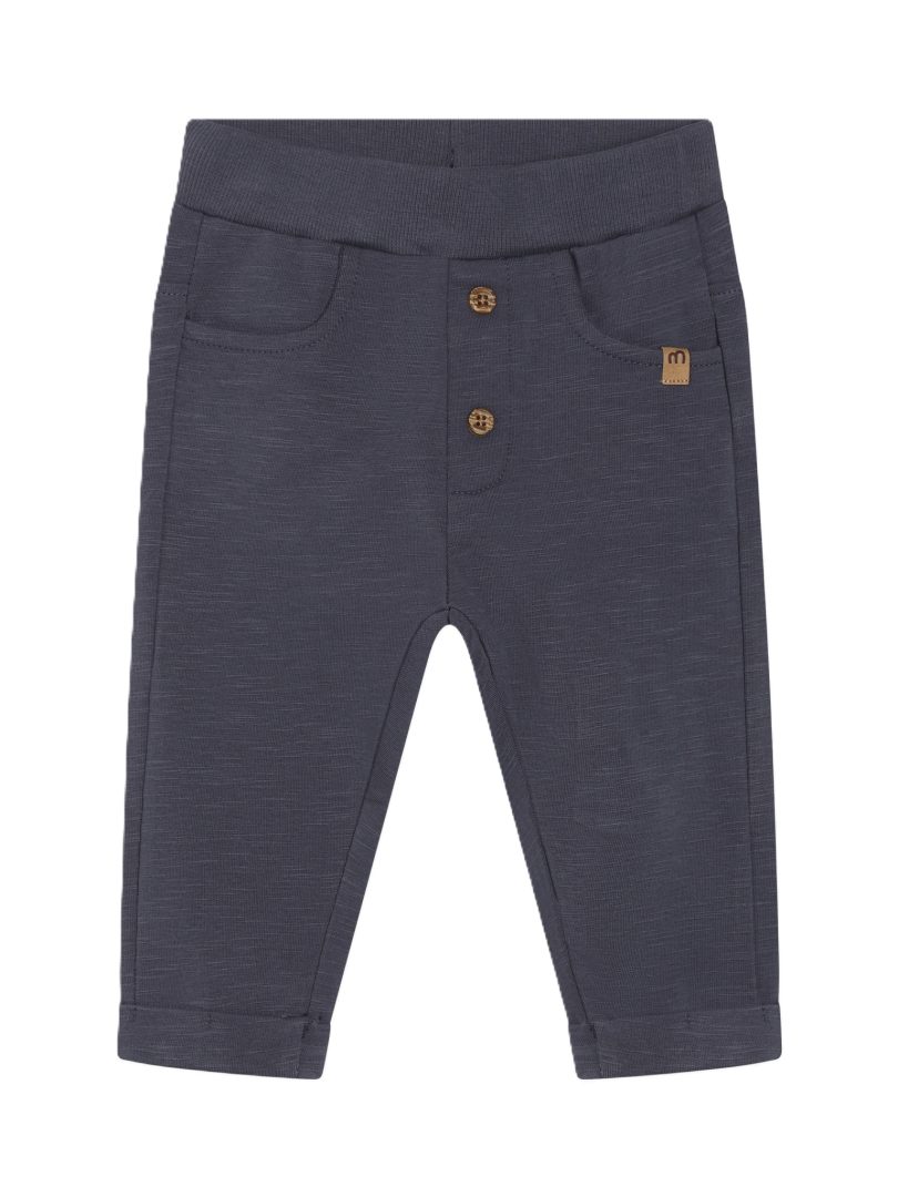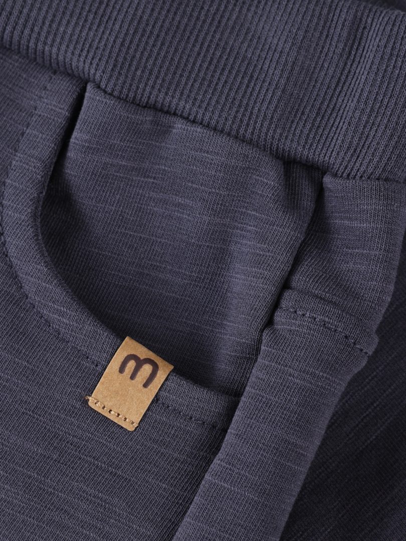 Joggebukser fra Minymo. Joggebuksene er ensfargete. De er elastiske i midjen og ved anklene. Det er to dekorative knapper foran. De er laget av en bomullsblanding. Sertifisert i henhold til GOTS – organisk CERES-0366