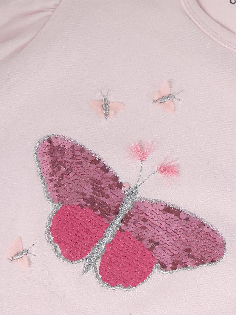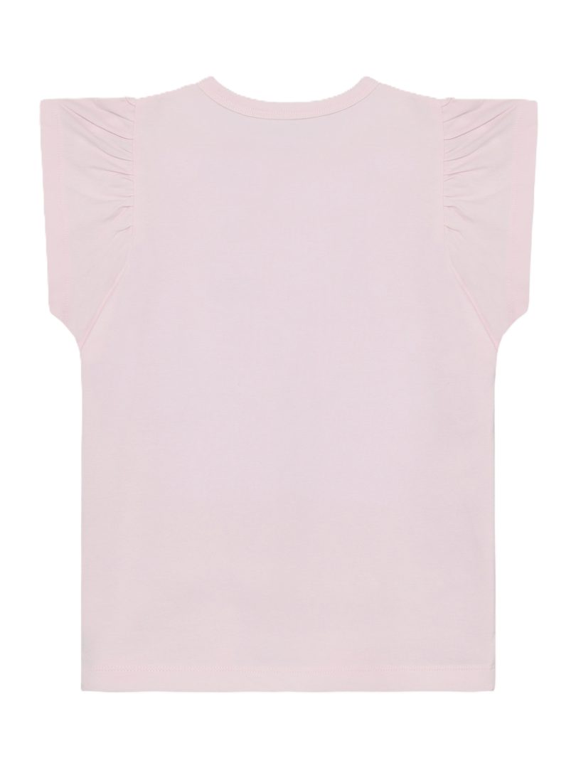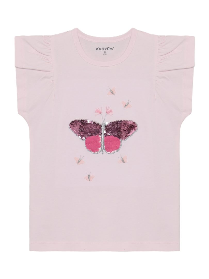 T-skjorte fra Minymo. T-skjorten er ensfarget med et trykk på forsiden. Den har små folder ved skuldrene.