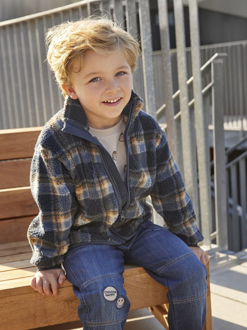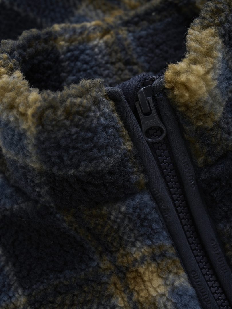 Checkered warm teddy fleece jacket with a high collar and full zipper. Made from a soft fabric for maximum warmth.