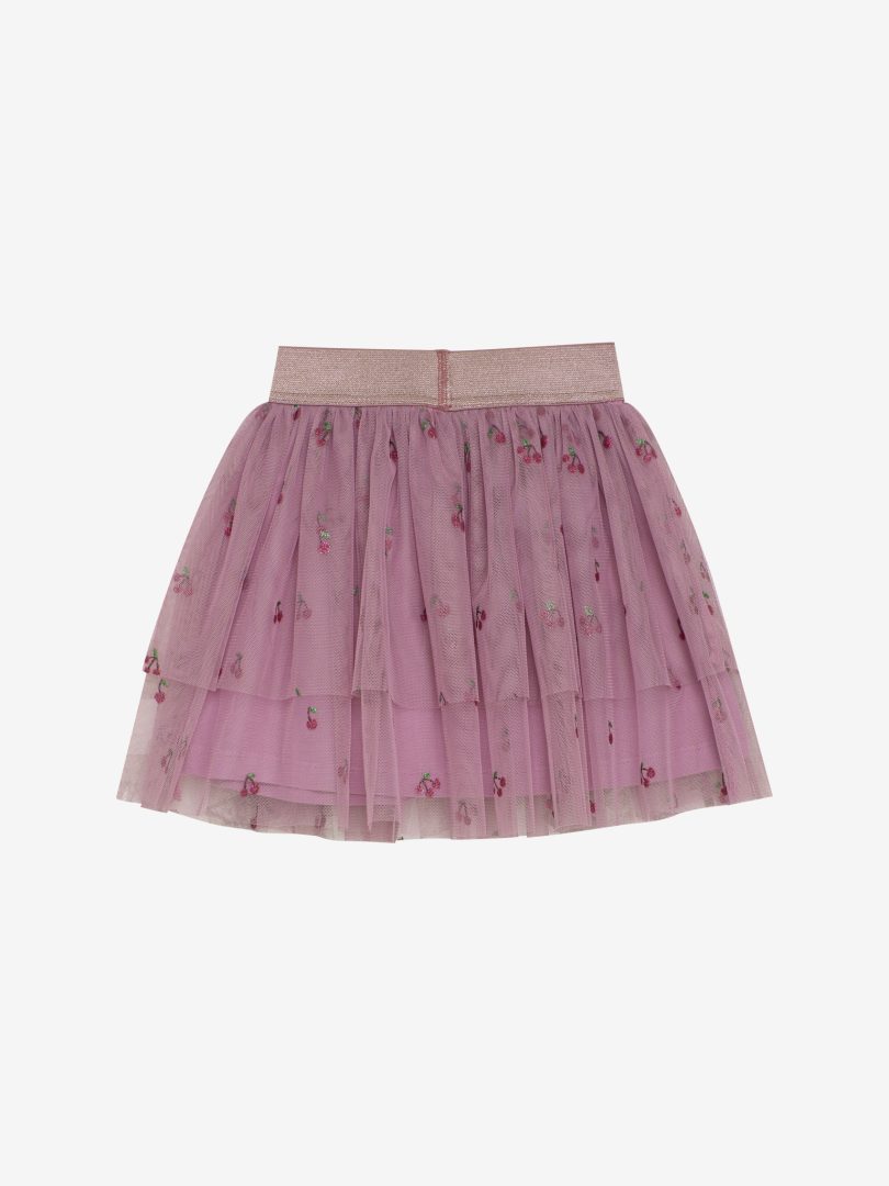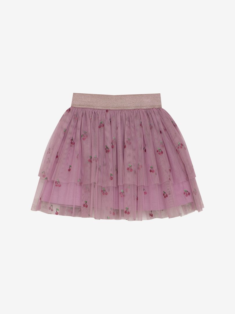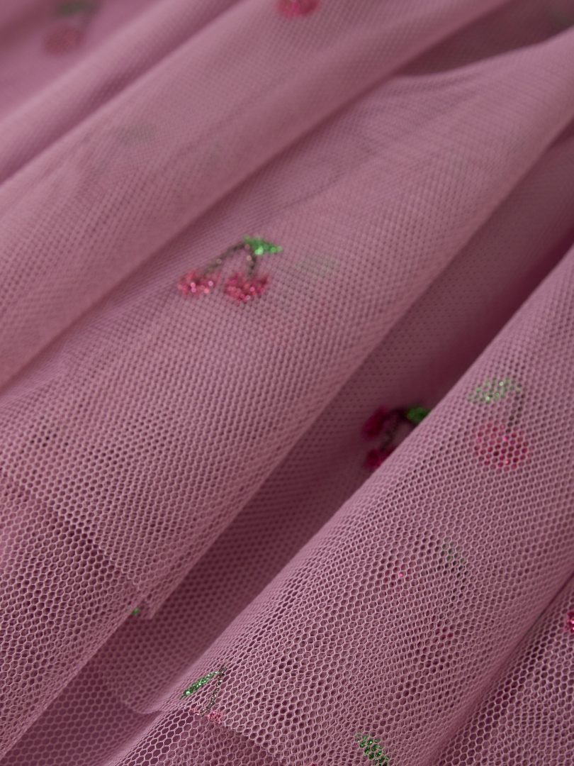 Tulle skirt adorned with beautiful glitter cherries and a glittery elastic waistband, perfect for festive and elegant occasions