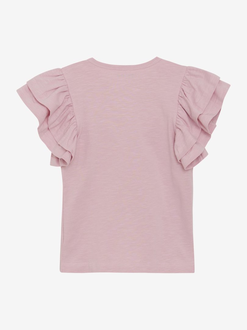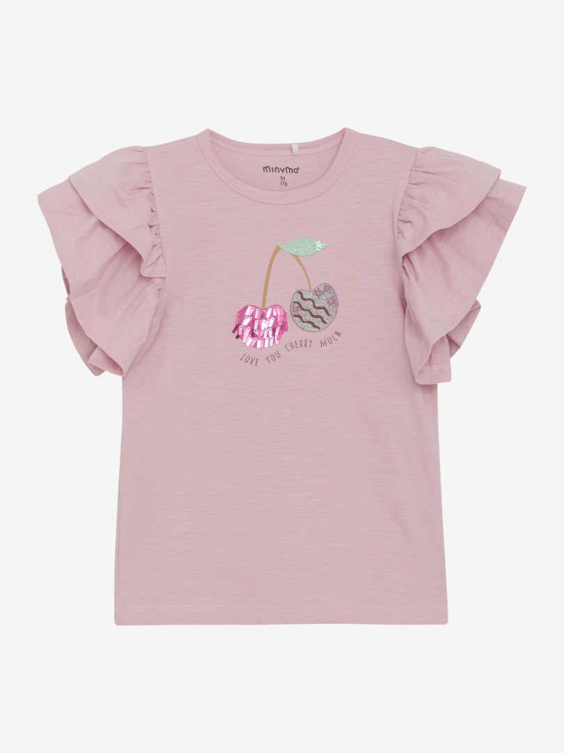 Short-sleeve T-shirt with a cute cherry motif on the chest. The T-shirt features beautiful frill sleeves, adding a feminine and charming touch.