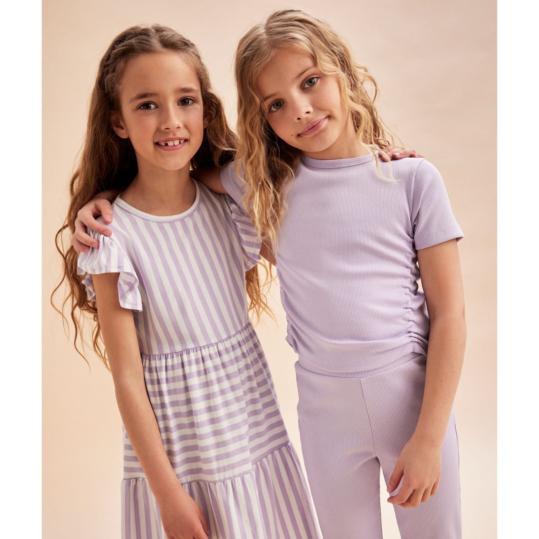 En ribbet kortermet T-skjorte med et elegant og minimalistisk design. Denne T-skjorten er laget av en myk bomullsblanding, som gir en komfortabel passform som varer hele dagen. Det enkle og allsidige utseendet gjør den perfekt for skole, lek og avslappende helger.